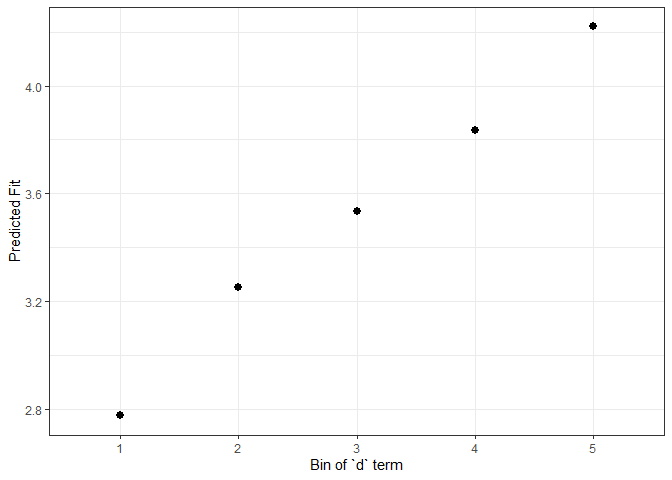 geom_pointrange() + theme_bw() + labs(x = "Bin of `d` term", y = "Predicted Fit")