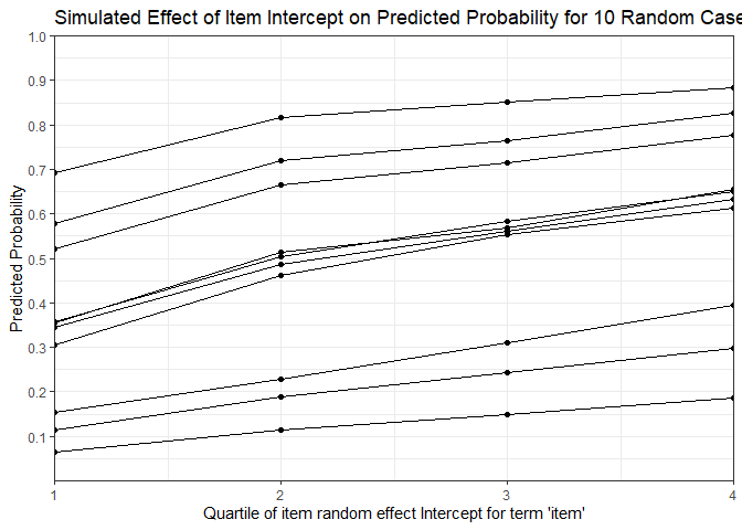 title = "Simulated Effect of Item Intercept on Predicted Probability for 10 Random Cases")
