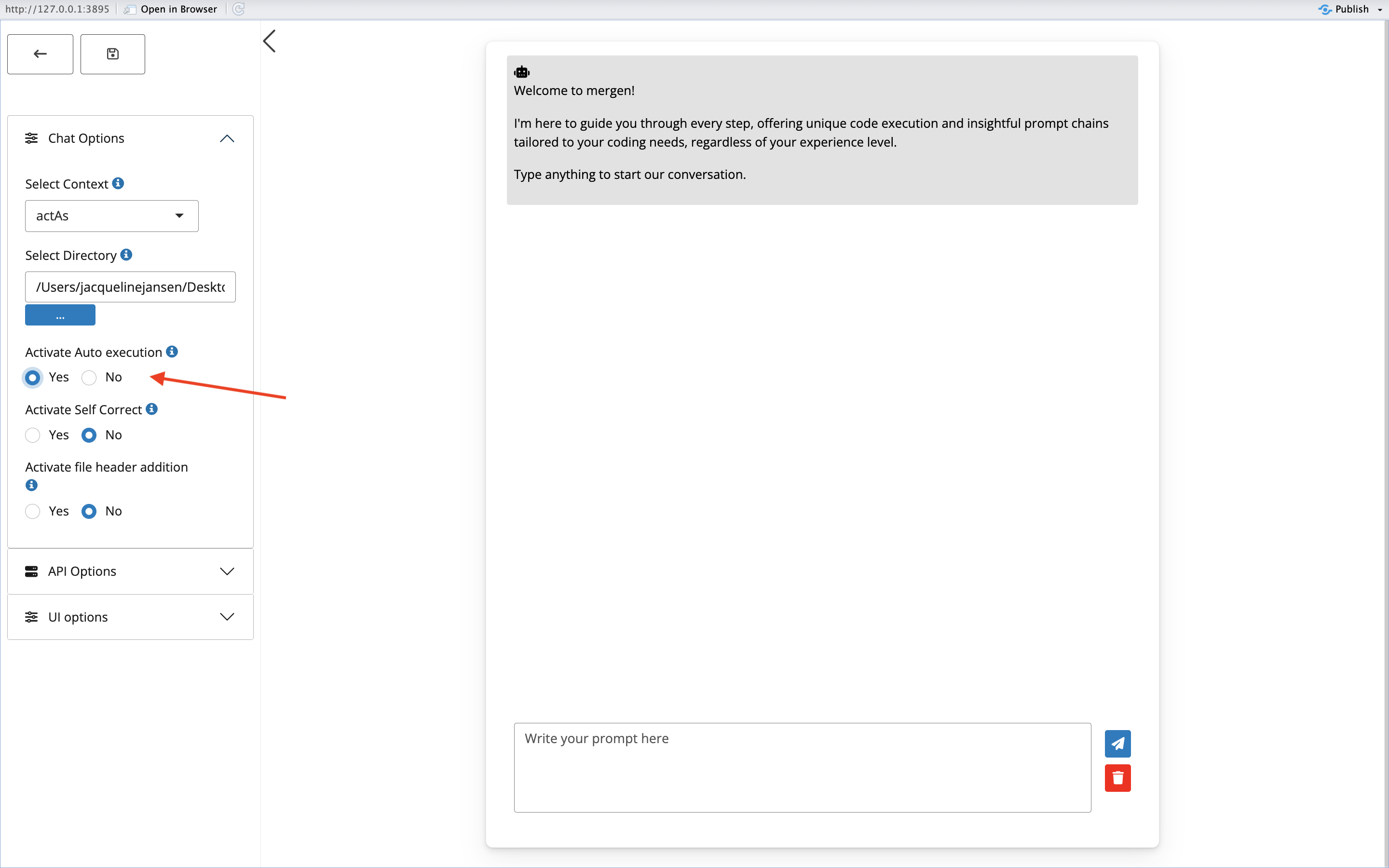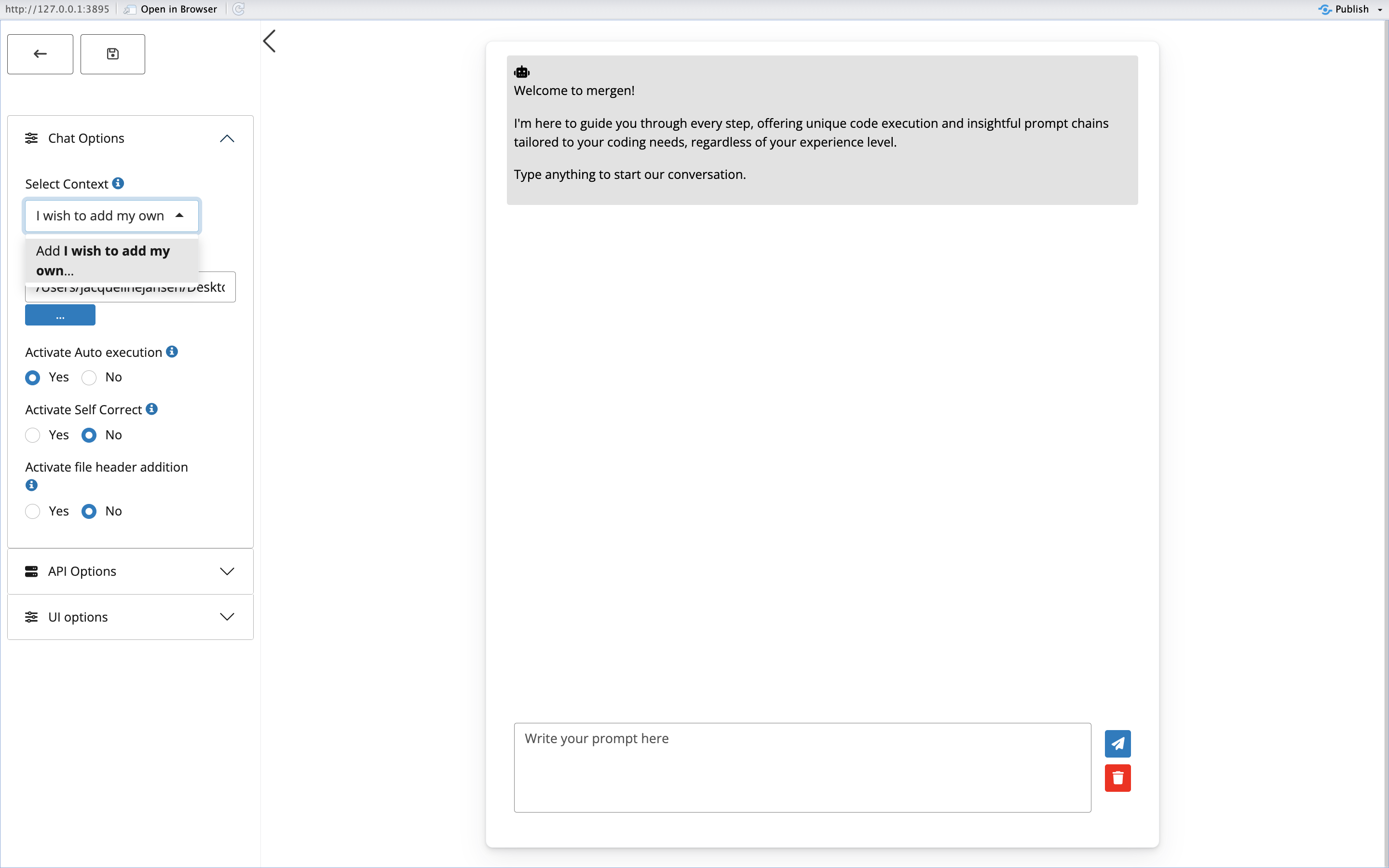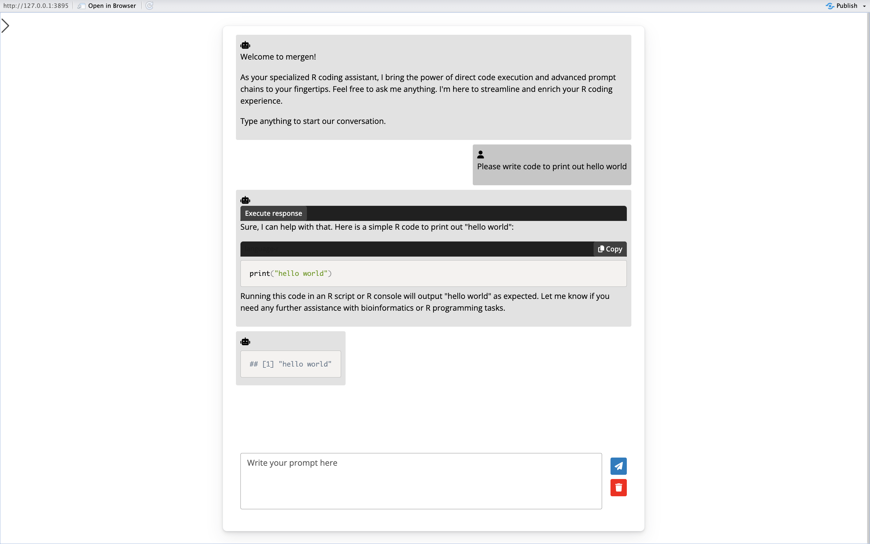 Once you have started chatting with your LLM of choice, any code that might be generated by the LLM can be run directly in the chat interface. To run code from a response, simply press the ‘execute code’ button on top of the response. This will run the code, and show you the output.
