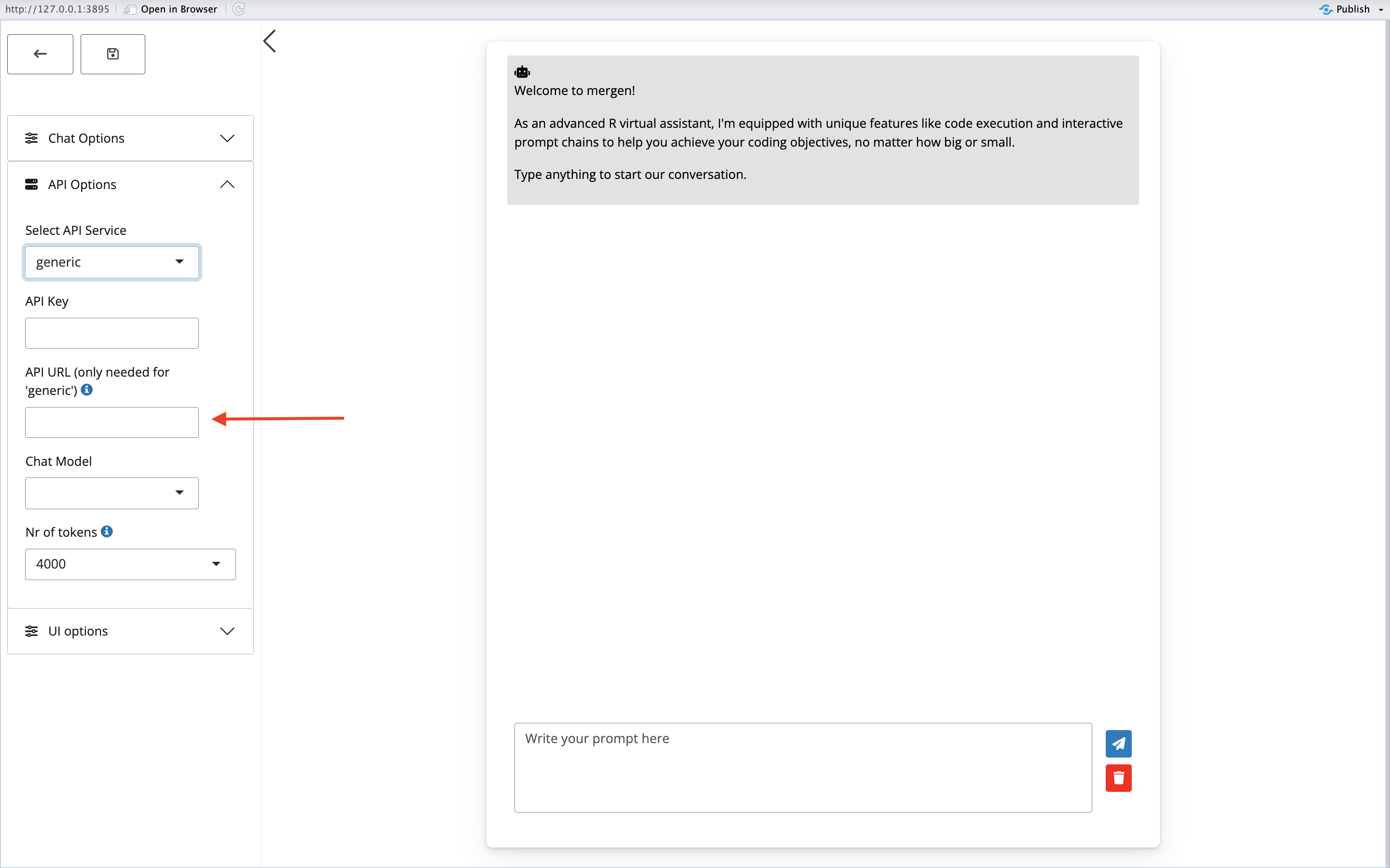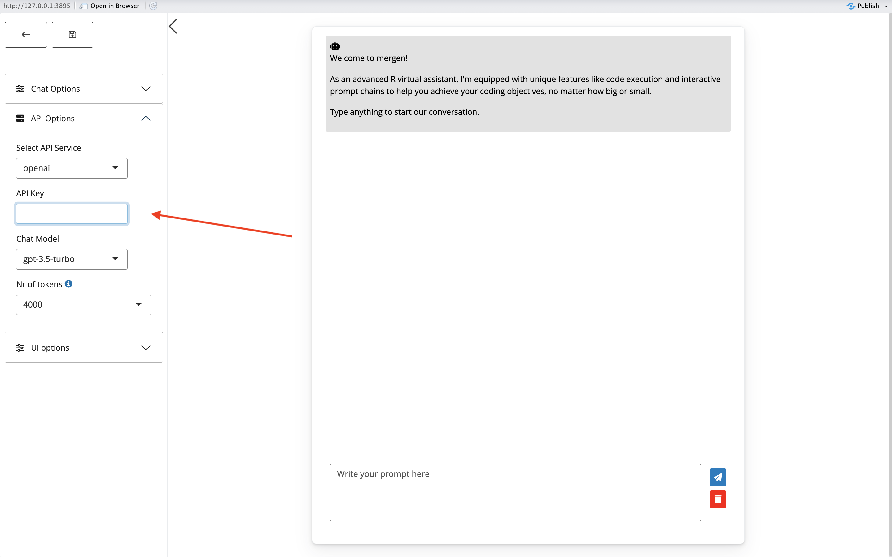 mergen Studio also allows you to set your key once in the app interface. Simply paste your key into the API key box on the side panel under API options.