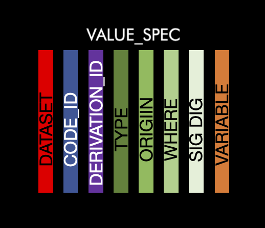 This table contains the information the information at the value level. There will be at least one row per dataset/variable combination. There is more than one row per dataset/variable combination if the combination has values which have differing metadata. For instance LBORRES that are different data types depending on the value. The information contained are as follows: