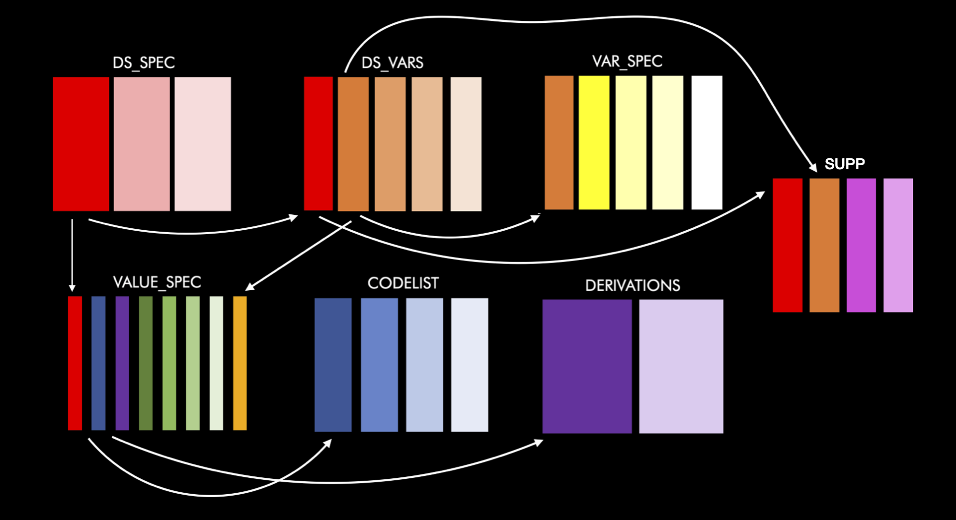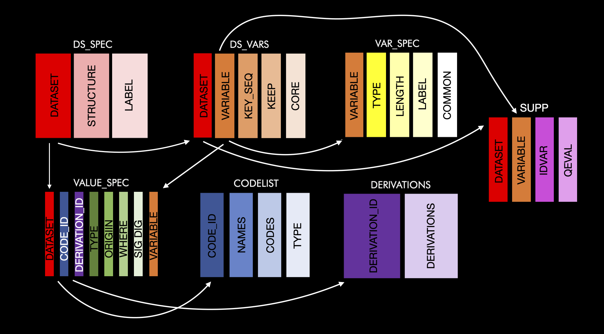 This table contains the information needed to create supplemental tables. If you want to add a variable which will go into a supplemental qualifier then you can create as normal (i.e. label information going to the var_spec table and derivation and origin going into the value_spec table), but you need to flag it as supplemental in the ds_vars table and add a row to the supp table. There is only a single row per dataset/variable, with the following information: