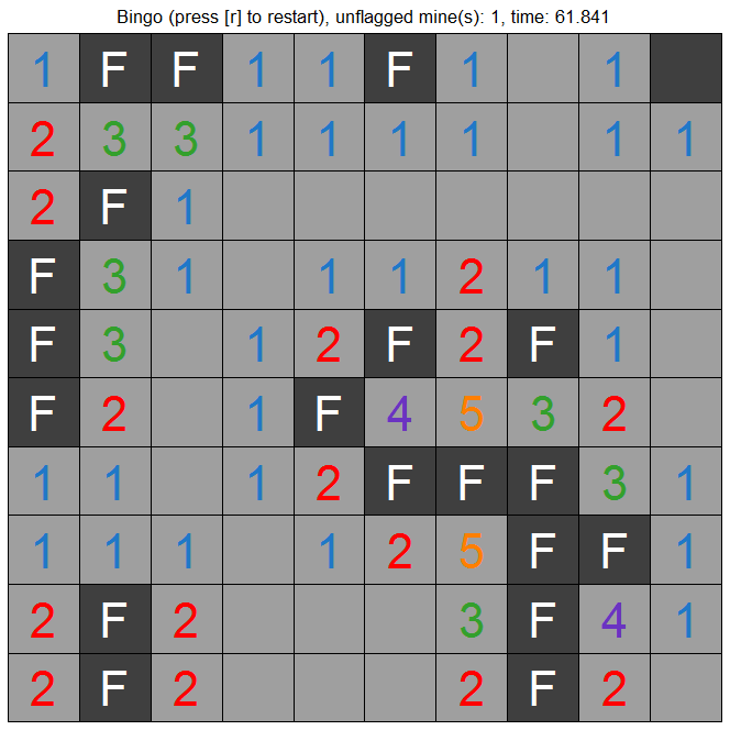 Let’s have fun with R! This is the very popular mine sweeper game! In this game, you are required to find out tiles that contain mines through clues from unmasking neighboring tiles. Each tile that does not contain a mine shows the number of mines in its adjacent tiles. If you unmask all tiles that do not contain mines, you win the game; if you unmask any tile that contains a mine, you lose the game. While in R, you may also run library(mineSweepR); help(run_game)