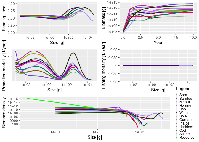 The following code loads the mizer package, loads some information about species in the North Sea that comes as an example with the package, sets up the parameters for the mizer model, and runs a simulation for 10 years.