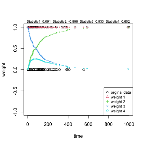 Perform the test using pooled Kaplan-Meier estimate of CDF as base function and visualize the weight functions