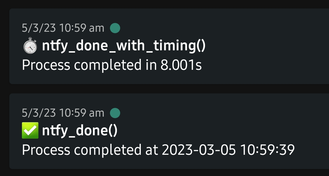 Note: the {magrittr} pipe %>% works differently and does not compose the same way, so this will result in a very short time report. Wrapping an entire pipeline with ntfy_done_with_timing() will work, though