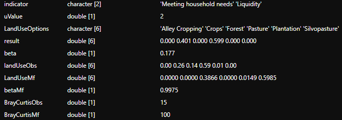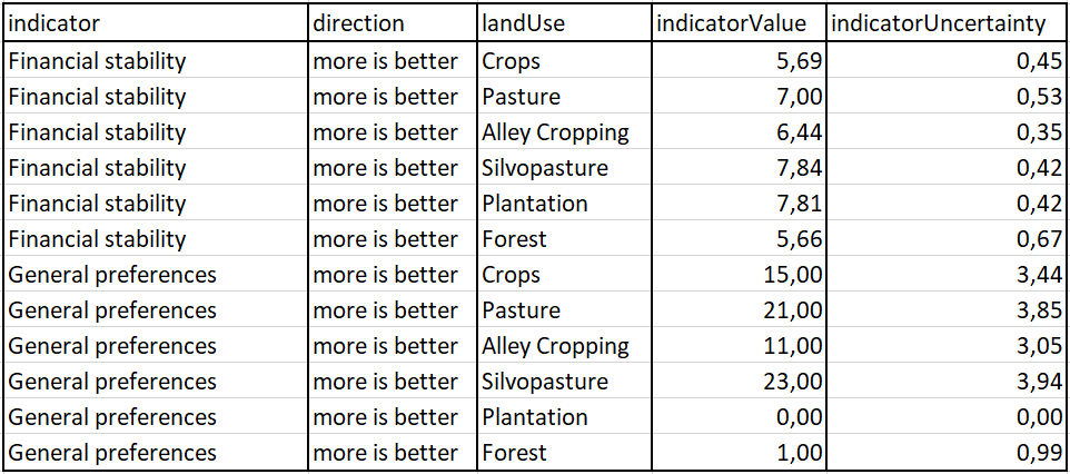 Enriching agricultural farms with agroforestry has been promoted as a means to enhance ecosystem functioning in farms in Panama, while maintaining important economic functions. Gosling et al. (2020) therefore used the here presented optimization model to understand smallholder farmer’s perceptions and values of agroforestry systems. They identified 10 relevant indicators for a predefined set of land-cover alternatives, which represent the farmer’s goals (such as long and short-term income or labor demand, as well as carbon and water regulation). A survey with local farmers provided the empirical basis in the form of the farmer’s expectations on the indicator performance of each land-cover (arithmetic mean) and its uncertainties (using the standard error of the mean across the survey’s respondents). Descriptions of the land-cover alternatives and indicators can be found in Tables 1 and 2 in Gosling et al. (2020).