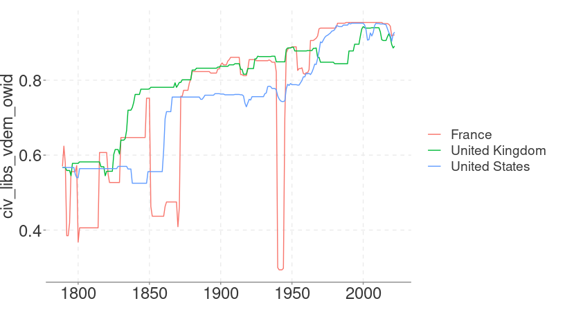 ggplot(aes(year, civ_libs_vdem_owid, colour = entity)) +