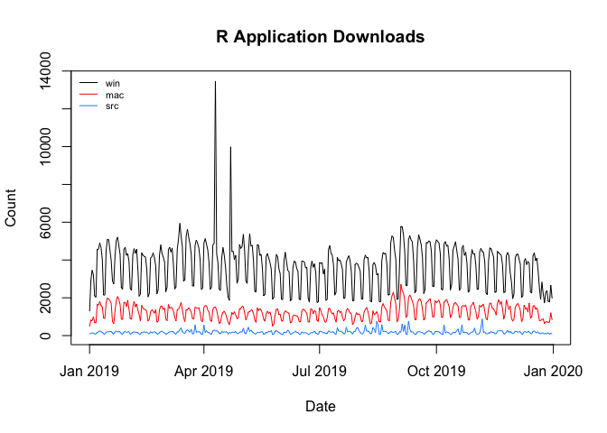 The graph above for R downloads shows the daily downloads of the R application broken down by platform (Mac, Source, Windows). In it, you can see the typical pattern of mid-week peaks and weekend troughs.
