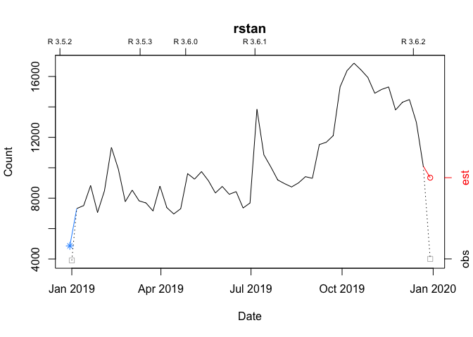 cranDownloads(packages = "rstan", from = "2020", to = "2020")