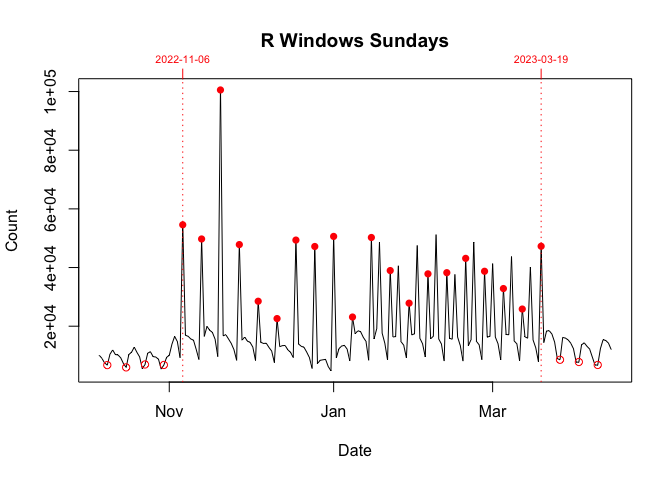 Between 06 November 2022 and 19 March 2023, this pattern was broken. On Sundays (06 November 2022 - 19 March 2023) and Wednesdays (18 January 2023 - 15 March 2023), there were noticeable, repeated orders-of-magnitude spikes in the daily downloads of the Windows version of R.