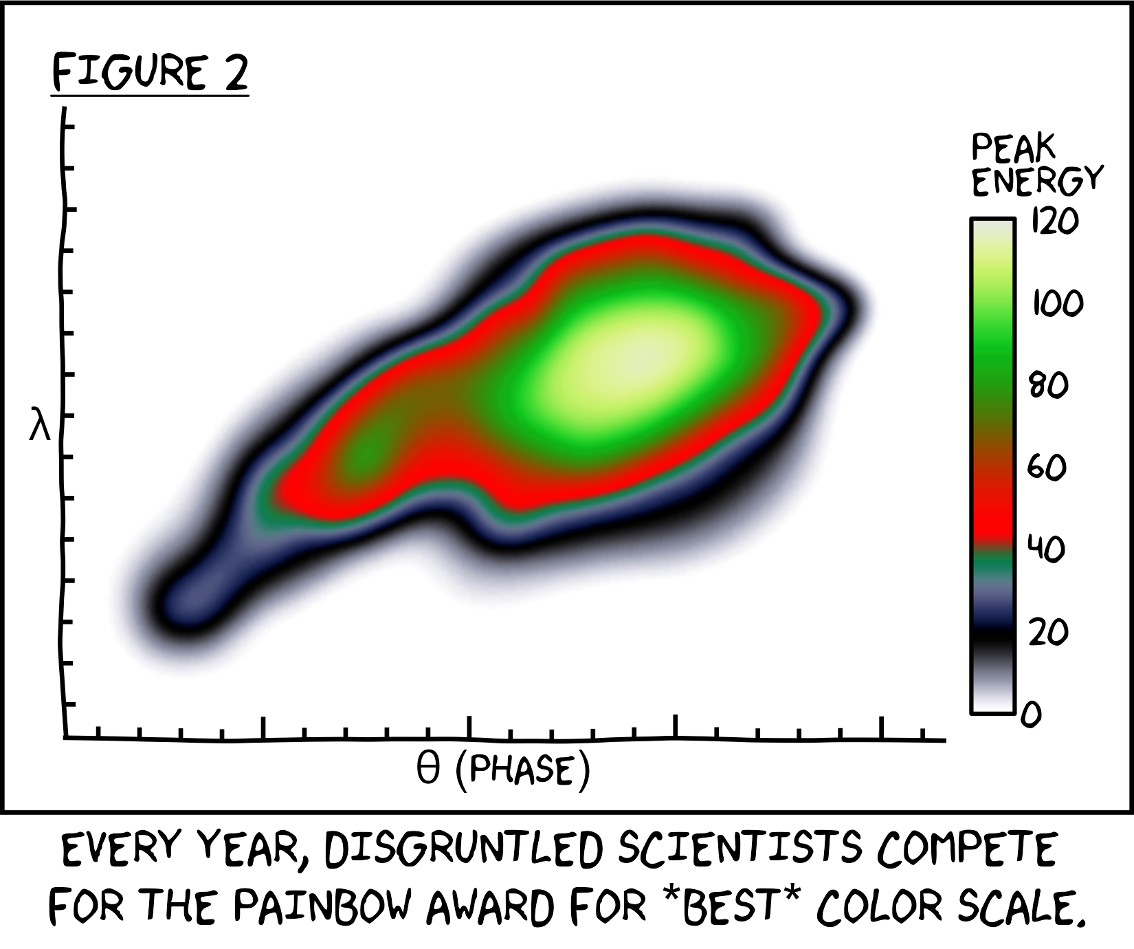 XKCD implied that this colormap is terrible, and even called it a “painbow”. However, these examples show that with certain tasks and data, this colormap outperforms even some of the most commonly cited “good” colormaps like viridis.