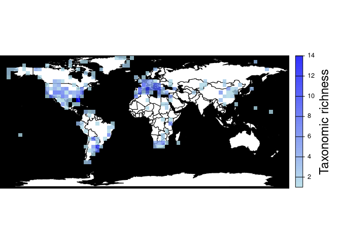 pbdb_map_richness(canidae, res = 5, rank = "species", do_plot = FALSE)