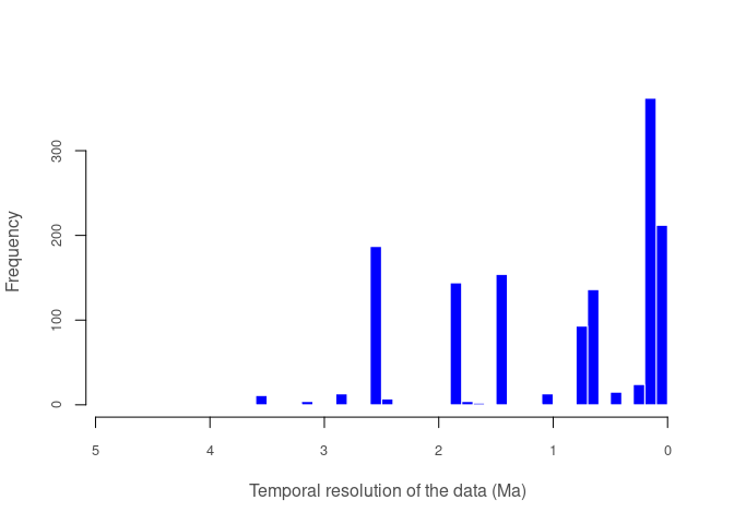 Returns a plot and a list with a summary of the temporal resolution of the fossil records.