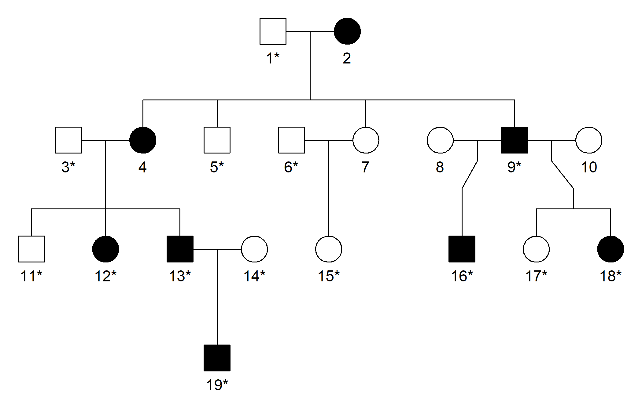 The family below is affected with an autosomal dominant disorder. The built-in dataset dominant1 contains genotypes for 14 of the members, at 248 SNP markers on chromosome 1. We will perform parametric linkage analysis on the dataset, hoping to identify a genomic region linked to the disease locus.