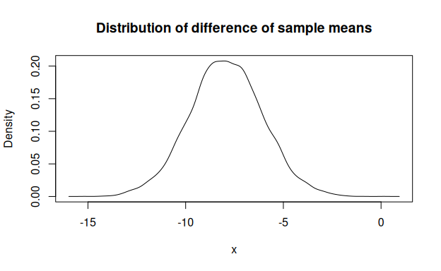 plot(mpg_diffmean, main = "Distribution of difference of sample means")
