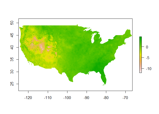 The plot shows that January 2013 was warmer than the average over the last 30 years. It also shows how easy it is to use the raster library to work with prism data. The package provides a simple framework to work with a large number of rasters that you can easily download and visualize or use with other data sets.