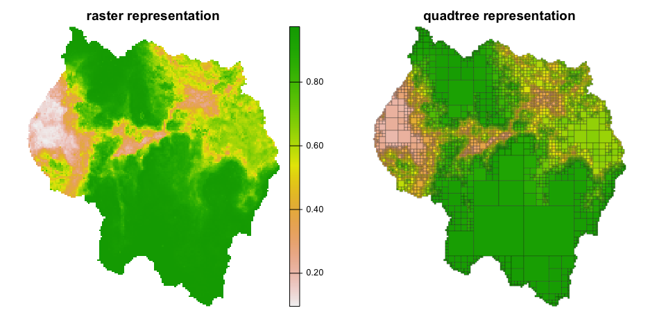 quadtree provides functionality for working with raster-like quadtrees (called “region quadtrees”), which allow for variable-sized cells.
