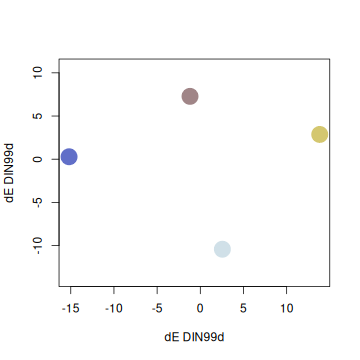 The palette may also be plotted with in a multidimensional scaling plot generated from the distance matrix of the colors in the palette.