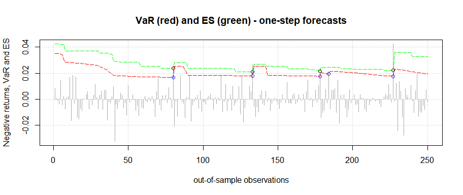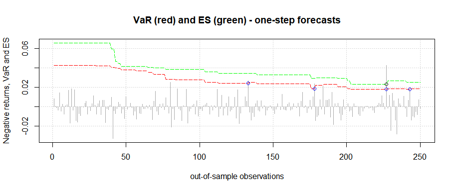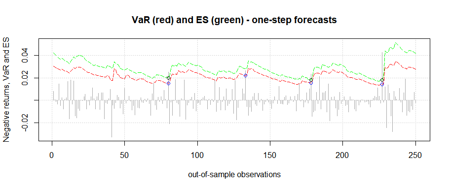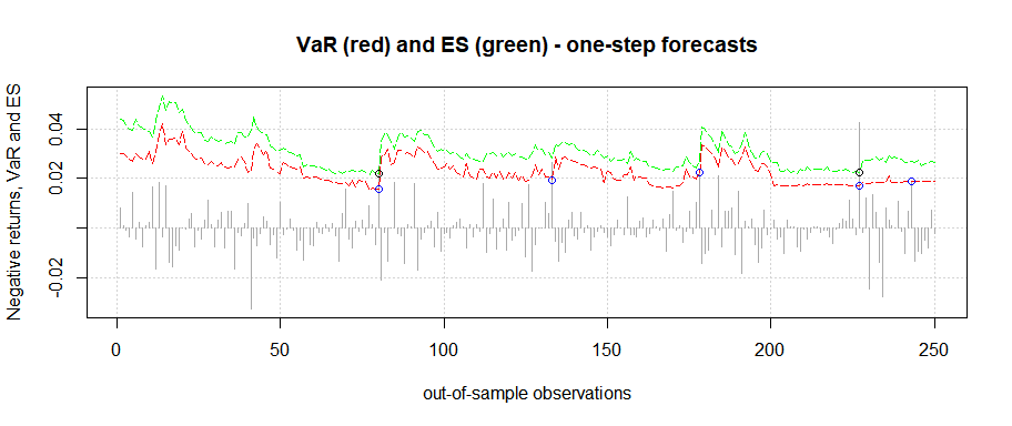 Shortfall by means of volatility weighted historical simulationFor further information on each of the functions, we refer the user to the manual or the package documentation.