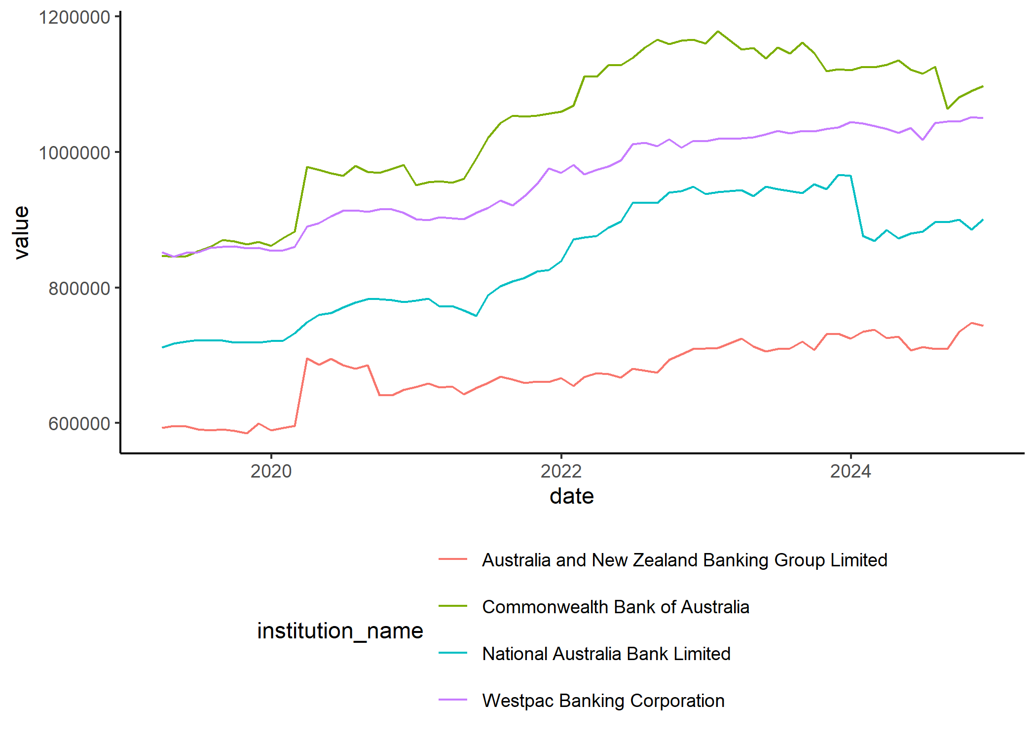 The ability to download and import APRA’s statistical publications with readapra greatly eases the analysis and visualisation of this data via packages such as ggplot2.