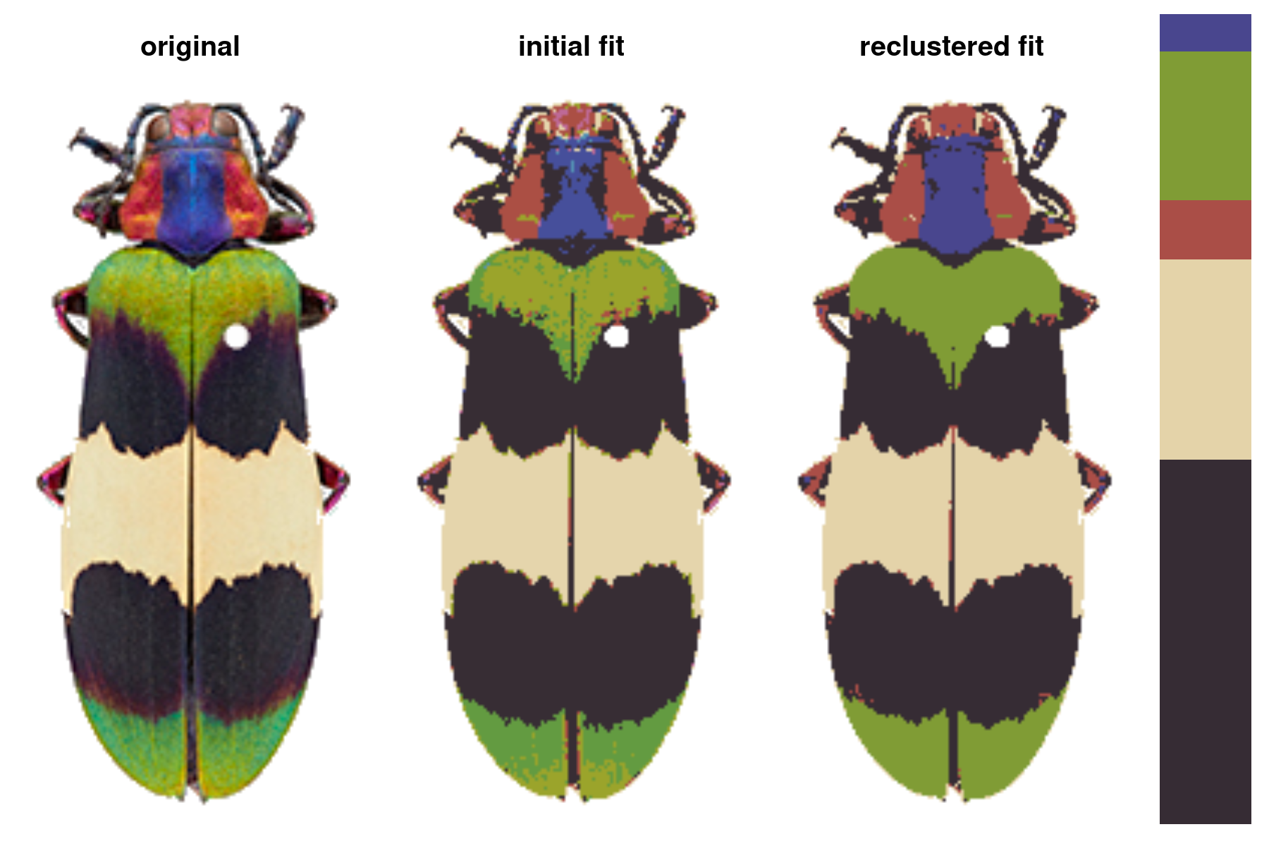 This is a package for making color maps, which are needed (or at least useful) for a wide range of color analysis techniques. It was born out of conversations with many biologists who found, to their surprise and mine, that generating color maps were the bottleneck step in their analyses. Fully automated methods rarely work all of the time, and are difficult to modify, while fully manual methods are subjective and time-consuming. This package tries to split the difference by giving you a mix of tools that will do a pretty good job with no user input, and then allow minor manual changes like merging and filtering layers or splitting components, before exporting them to the next step of your analysis (e.g. pavo, patternize). It’s also, for the most part, totally deterministic – no arbitrary seed-setting for repeatability.