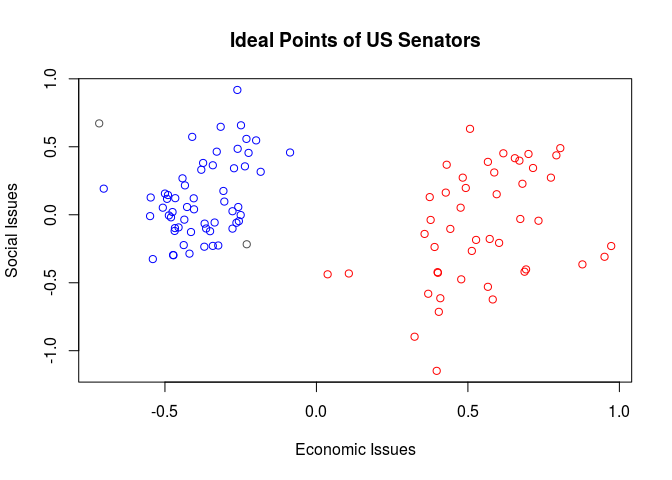 In the following example we use the DWNOMINATE data set assembled by Poole and Rosenthal et al, which estimates the ideological positions of US politicians. Suppose we want to create a new column for our data frame indicating political party by colour (red for Republicans, blue for Democrats):