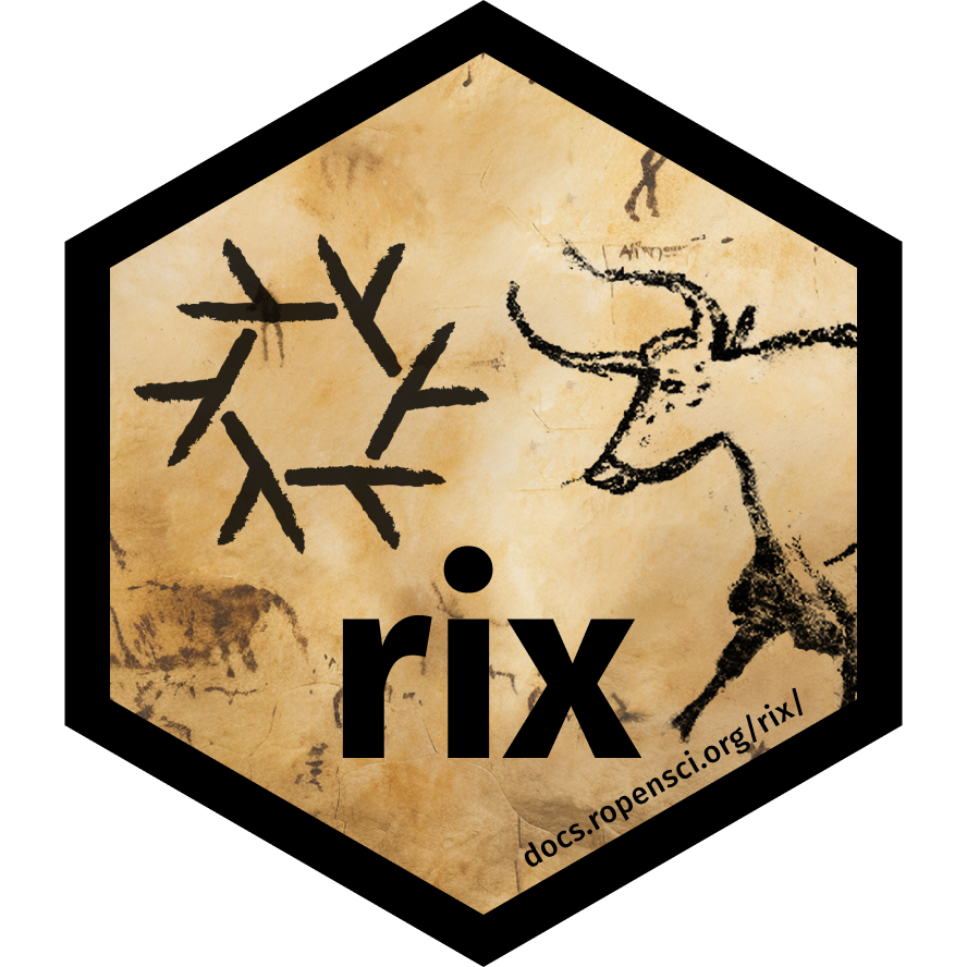 Thanks to the Nix community for making Nix possible, and thanks to the community of R users on Nix for their work packaging R and CRAN/Bioconductor packages for Nix (in particular Justin Bedő, Rémi Nicole, nviets, Chris Hammill, László Kupcsik, Simon Lackerbauer, MrTarantoga and every other person from the Matrix Nixpkgs R channel).