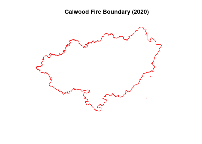 plot(boundary$geometry, main = "Calwood Fire Boundary (2020)",