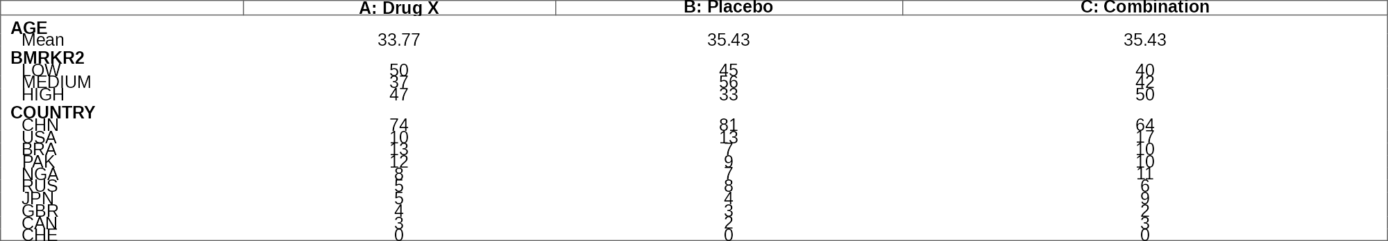 analyze(c("AGE", "BMRKR2", "COUNTRY"))
