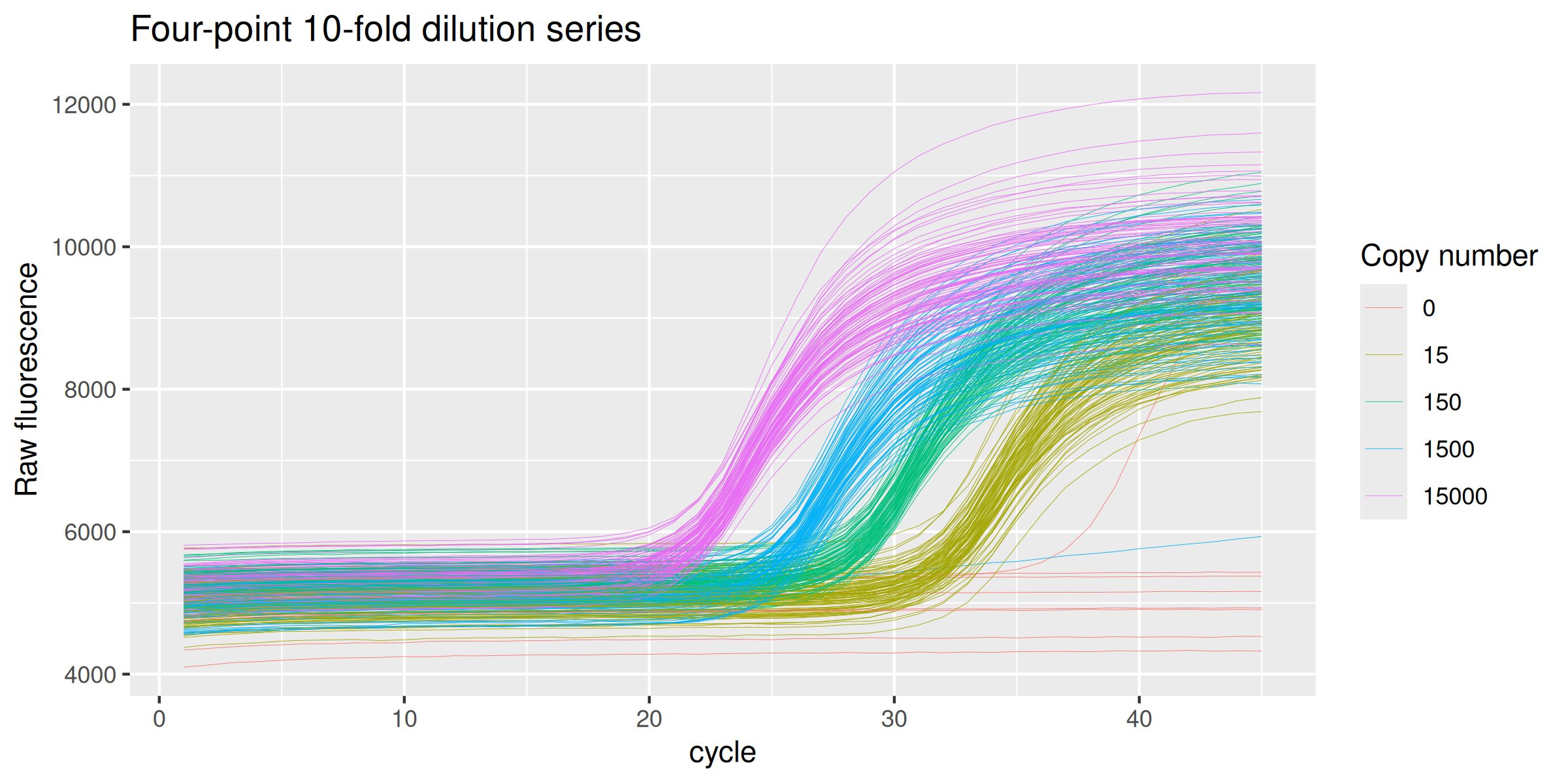 labs(y = "Raw fluorescence", colour="Copy number", title = "Four-point 10-fold dilution series") +