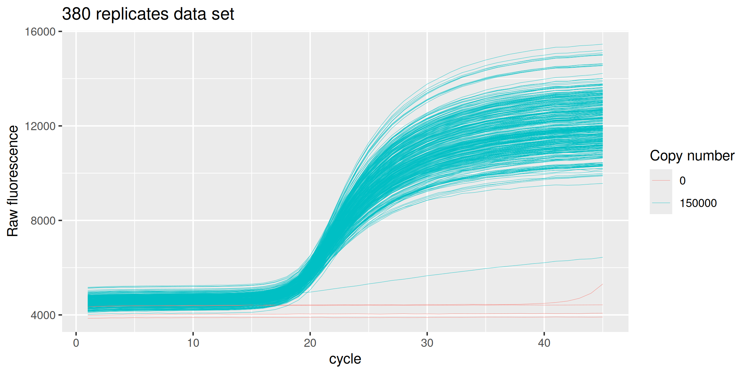 labs(y = "Raw fluorescence", colour="Copy number", title = "380 replicates data set") +