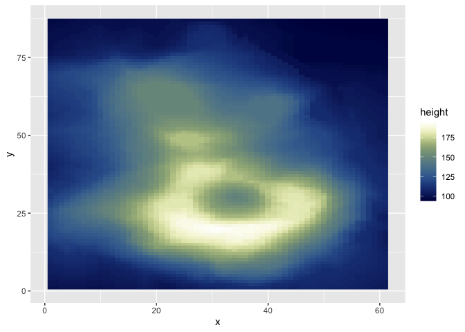 )ggplot(volcano, aes(x = x, y = y, fill = height)) +