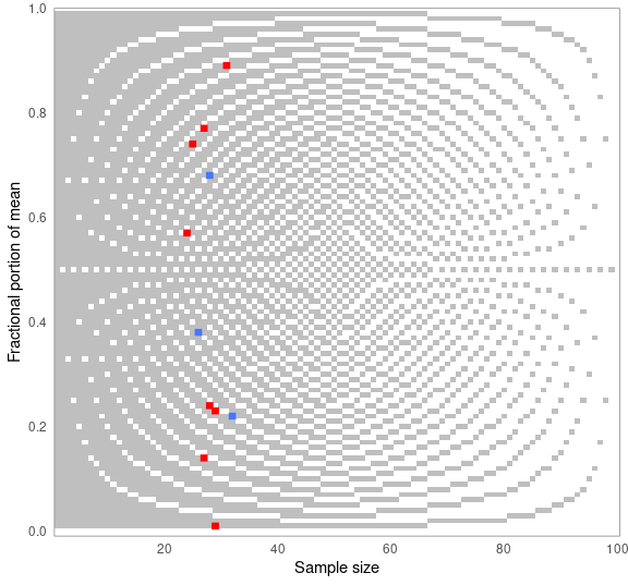 You can choose how the means are reconstructed for testing — below, rounded up from 5. When visualizing results, the plot will adjust automatically. Blue dots are consistent values, red dots are inconsistent ones: