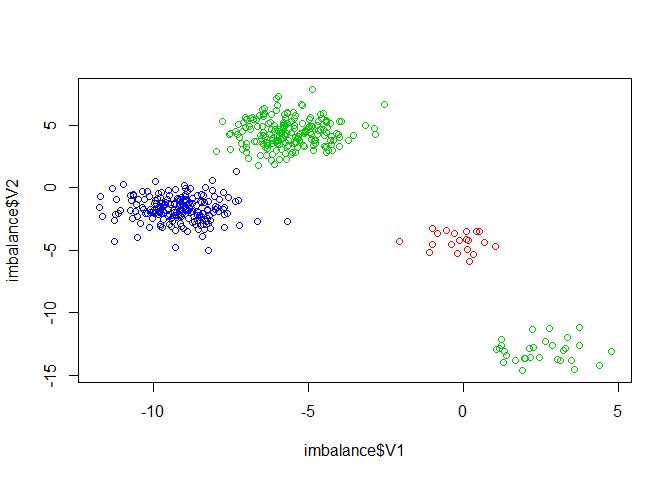 plot(imbalance$V1, imbalance$V2, col=imbalance$class)