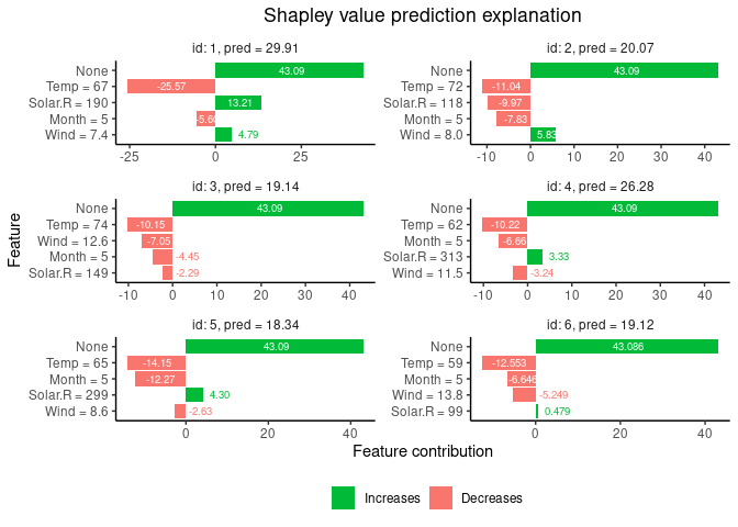 See the general usage vignette for further basic usage examples and brief introductions to the methodology. For more thorough information about the underlying methodology, see Aas, Jullum, and Løland (2021), Redelmeier, Jullum, and Aas (2020), Jullum, Redelmeier, and Aas (2021), Olsen et al. (2022), Olsen et al. (2024) . See also Sellereite and Jullum (2019) for a brief paper about the previous (< 1.0.0) version of the package.