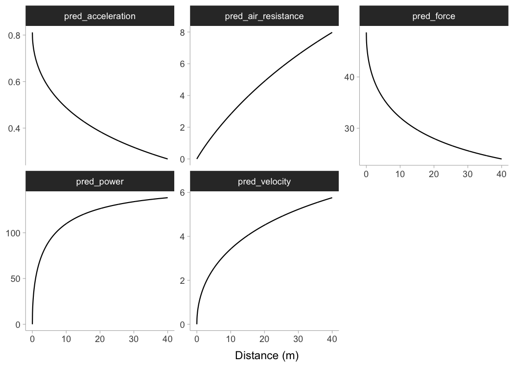 To plot predicted velocity, acceleration, air resistance, force, and power over distance, use shorts:predict_XXX()