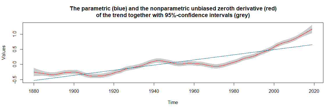 Another contribution that was made to package version 1.1.0 is a function for testing the trend graphically for linearity. Based on a previously obtained nonparametric estimate of the trend or its derivatives, an asymptotically unbiased series of estimates with its confidence bounds is obtained and plotted. By choice, different polynomial regression lines can be displayed alongside the nonparametric trend estimates and its confidence bounds. The estimated slope of a simple linear regression model of the trend and the constant with value zero are displayed against the estimates of the first and second derivatives, respectively. If, for a selected confidence level 100s%, clearly more than (1 - s)100% of the estimated parametric line lies outside of the confidence bounds, the null hypothesis can be rejected. The following example is based yet again on the mean monthly temperature changes data and illustrates the linearity test with respect to the nonparametric trend. The derivatives are skipped at this point for simplicity. Moreover, a confidence level of 95% was chosen.