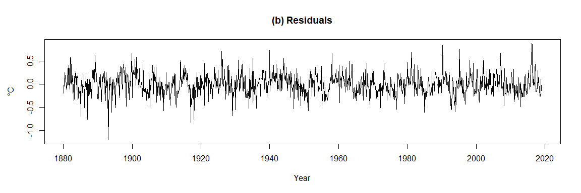 With the package version 1.1.0 different functions were newly introduced that allow for forecasting trend-stationary series and other functionalities. Based on the previous example, the following code shows how to obtain point forecasts and 95% forecasting intervals for the mean monthly temperature changes data and directly create a plot of the forecasting results. For simplicity, it is assumed that the rest term of the additive model follows an ARMA(1,1) model with normally distributed innovations. However, via the functions a bootstrap method for non-Gaussian cases can be applied as well. Furthermore, an automatic order selection for the ARMA model is also built-in that is triggered, if no values are passed to the respective arguments that define the orders.
