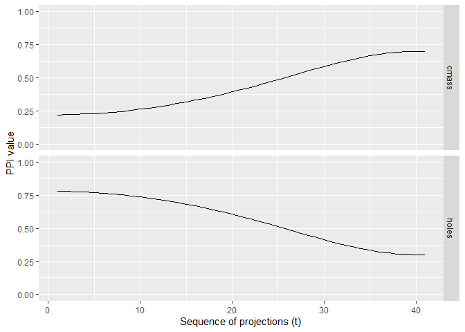 To evaluate the index behaviour on a known input distribution we can trace its value when interpolating a tour path, for example moving from nuisance and structured projection.