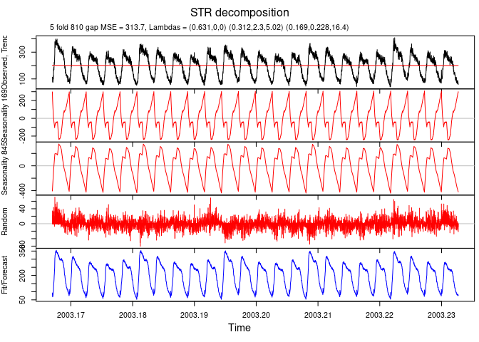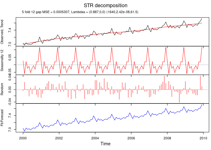 The goal of stR is to provide two methods for decomposing seasonal data: STR (a Seasonal-Trend decomposition procedure based on Regression) and Robust STR. In some ways, STR is similar to Ridge Regression and Robust STR can be related to LASSO. They allow for multiple seasonal components, multiple linear covariates with constant, flexible and seasonal influence. Seasonal patterns (for both seasonal components and seasonal covariates) can be fractional and flexible over time; moreover they can be either strictly periodic or have a more complex topology. The methods provide confidence intervals for the estimated components. The methods can also be used for forecasting.