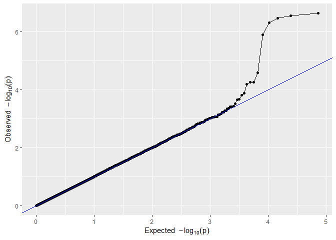plot(GWASDrops, plotType = "qq", trait = "grain.yield")