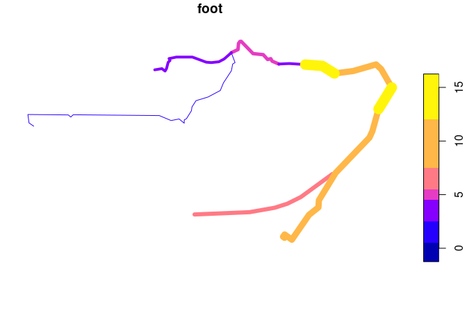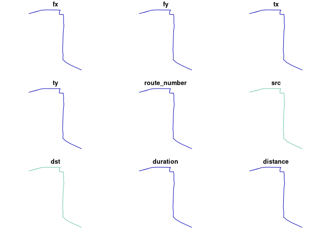 The package can also allocate flows to the road network, e.g. with CycleStreets.net and the OpenStreetMap Routing Machine (OSRM) API interfaces. These are supported in route_*() functions such as route_cyclestreets and route_osrm():