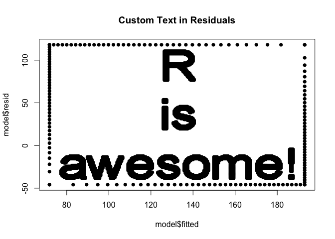 model plot(model$fitted, model$resid, pch = 16, main = "Custom Text in Residuals")