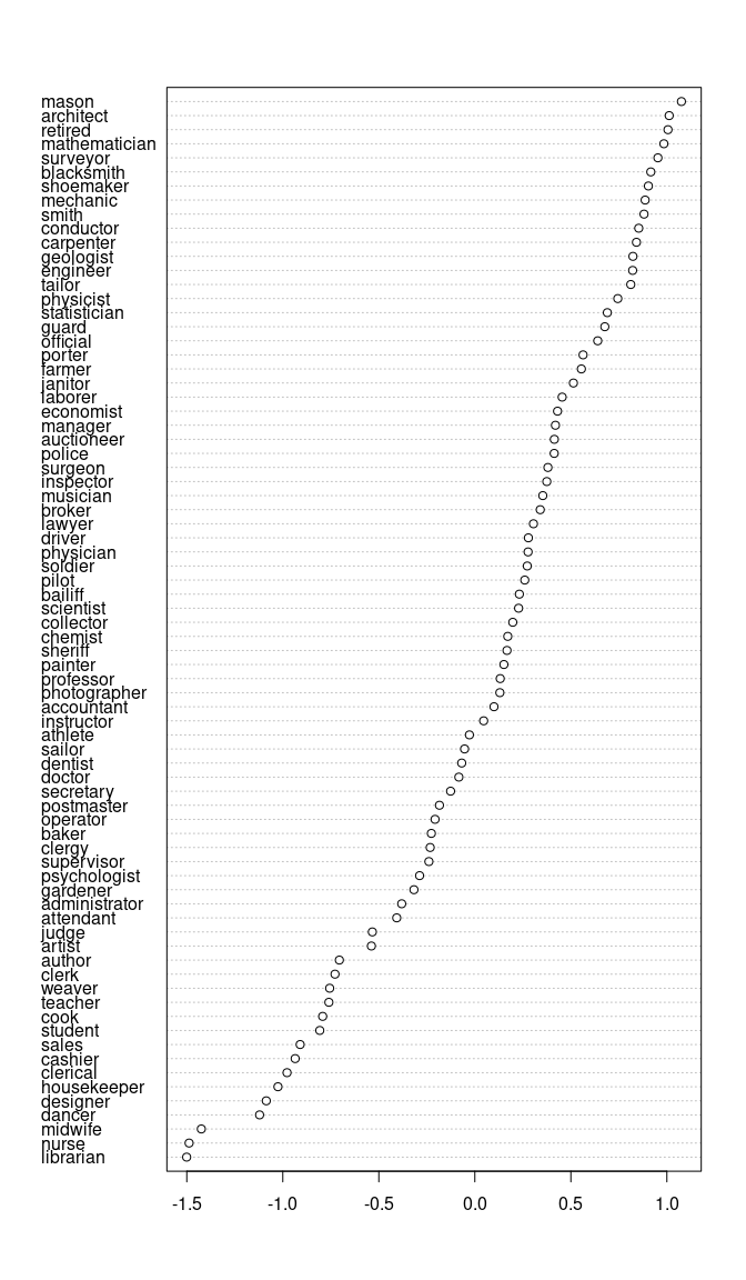 #>         clerk       student        porter      gardener       dentist