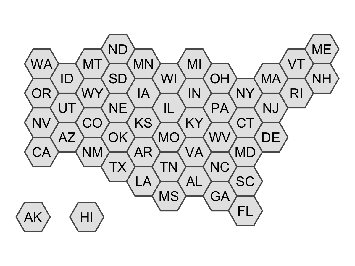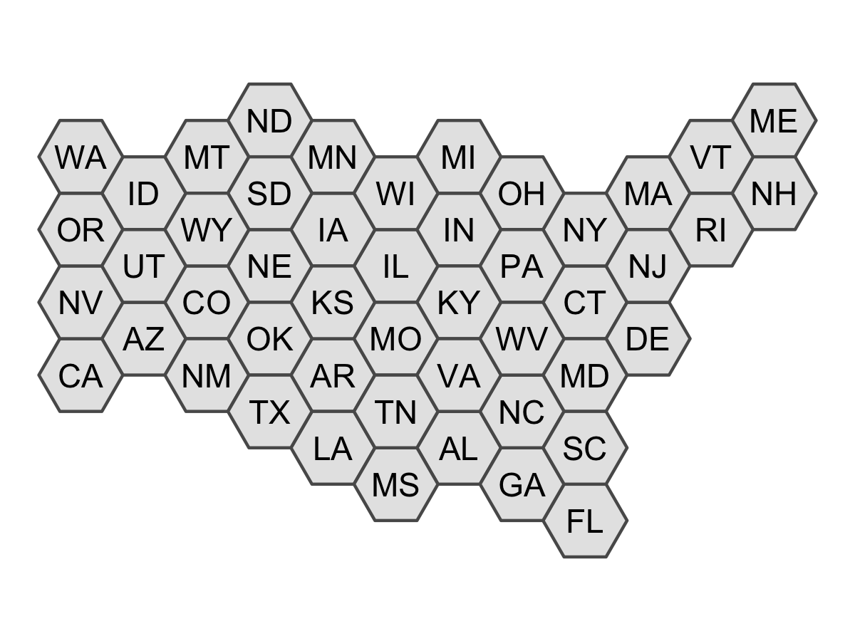 To create a single tile map, the generate_map() function can be used. In the following example, a tile map with flat-topped hexagons is generated for the contiguous United States using the governors dataset, which is part of the tilemaps package.