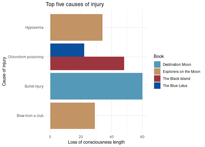 coord_flip()What happens if we need more colours than 5? The functions in the package can fix that. We’ll plot the top ten causes of injury.