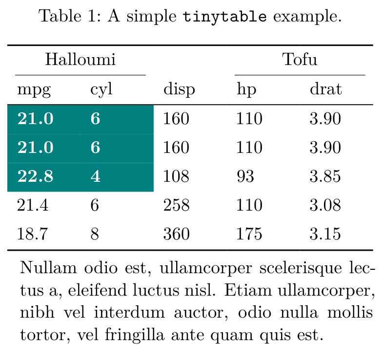 More complex tables can be created by calling arguments and chaining functions together. In the next example, we add a caption, footnote, colors, styles, and spanning column headers: