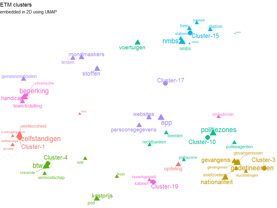 labs(title = "ETM topics", subtitle = "embedded in 2D using UMAP")