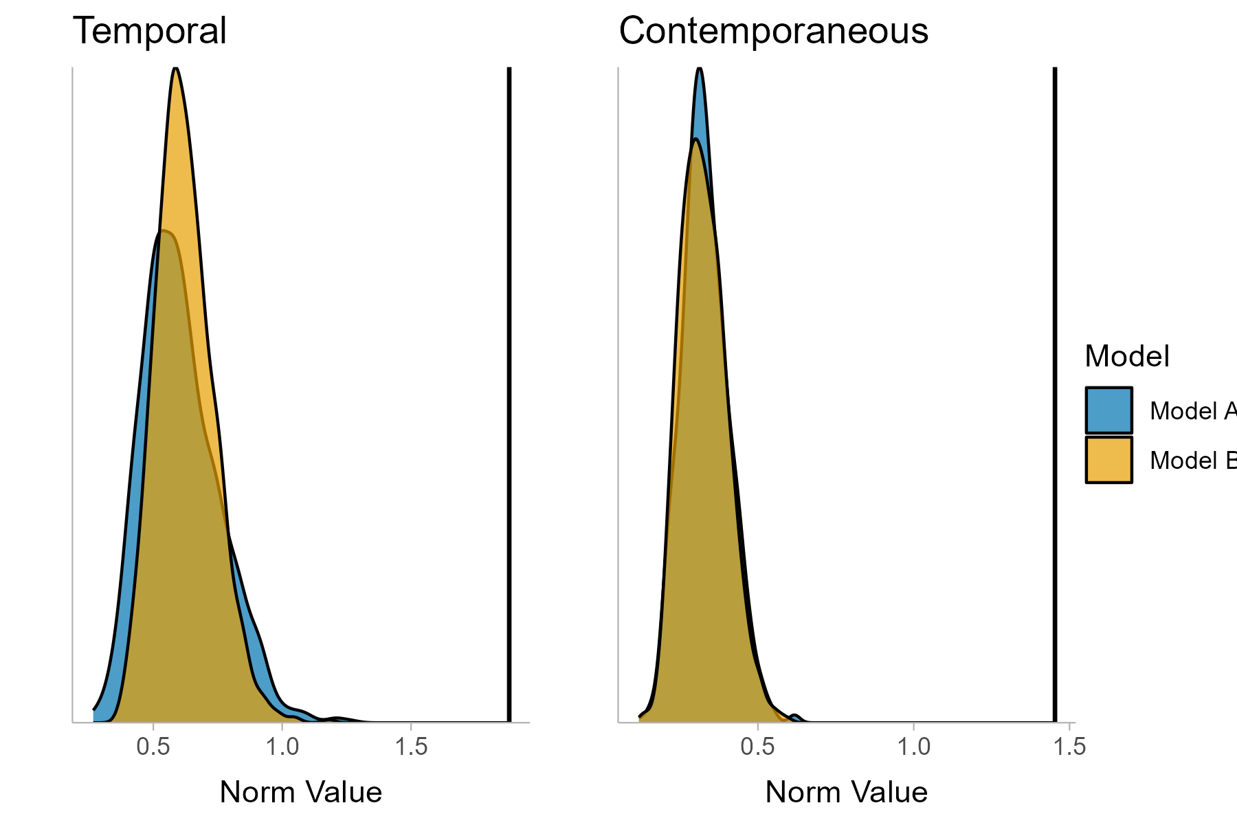 This is an example of how to use the package to compare two network models. We here use BGGM to estimate the networks, but the stan_gvar function can be used as well.